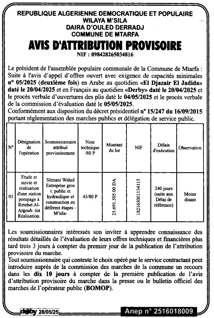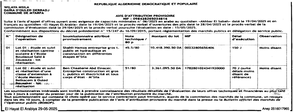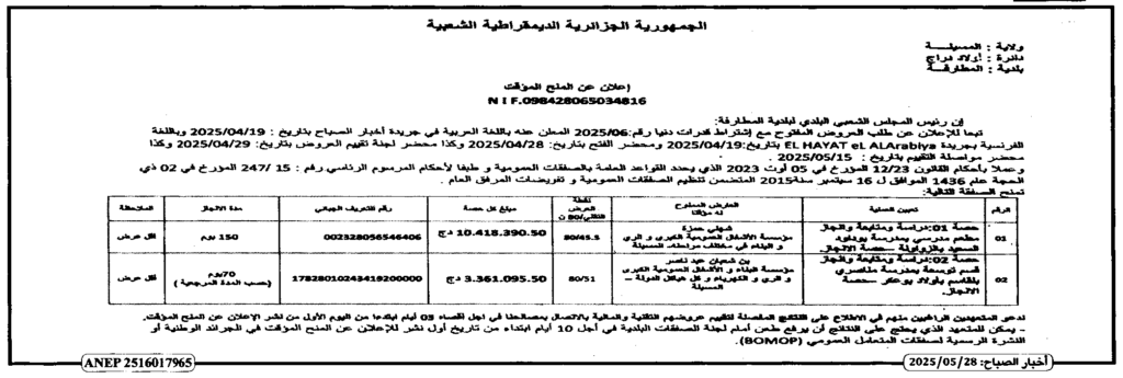 إعلان عن المنح المؤقت دراسة ومتابعة وانجاز مطعم مدرسي وقسم توسعة/ بلدية المطارفة