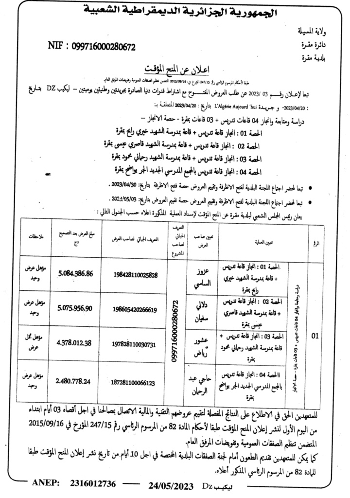 إعلان عن المنح المؤقت: دراسة ومتابعة وانجاز 04 قاعات تدريس + 03 قاعات بمقرة -حصة الانجاز- بلدية مقرة