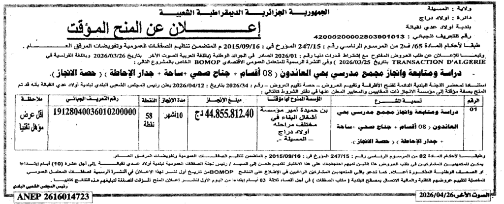 إعلان عن المنح المؤقت دراسة ومتابعة وانجاز مجمع مدرسي بحي العائدون/ بلدية أولاد عدي لقبالة