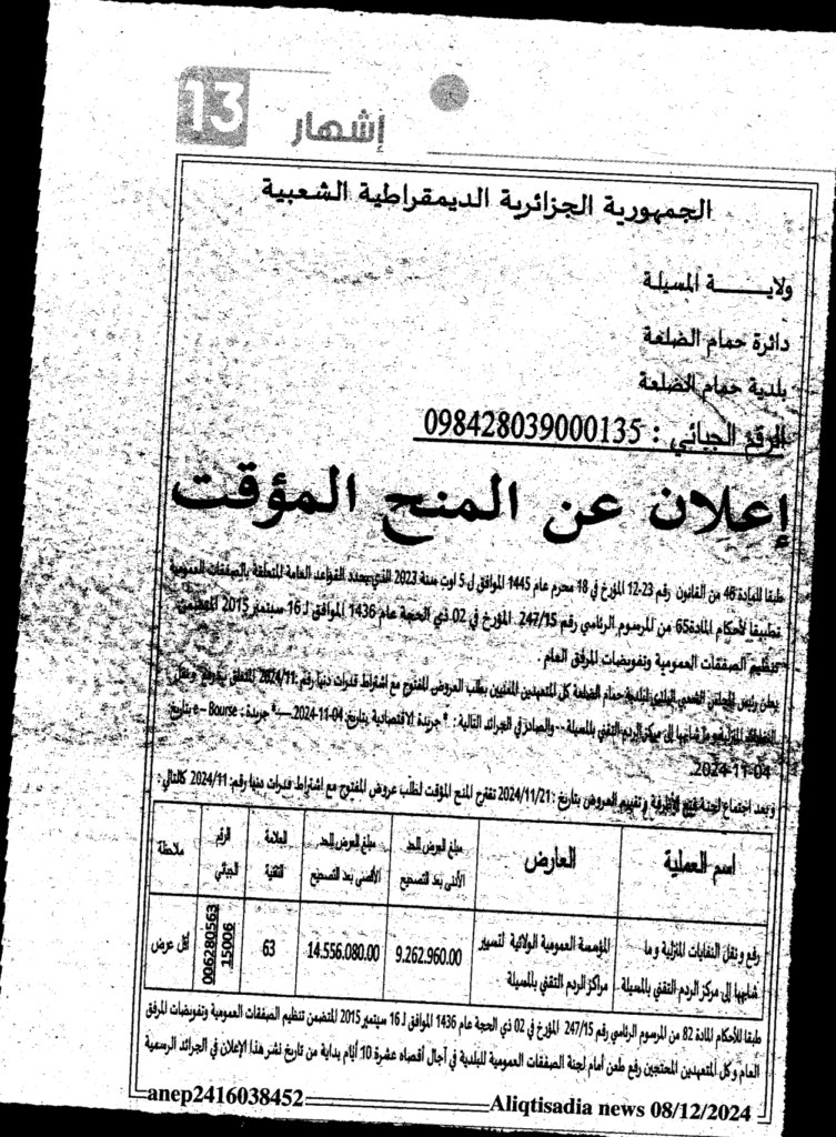 إعلان عن المنح المؤقت رفع ونقل النفايات المنزلية وما شابهها إلى المركز الردم التقني/ بلدية حمام الضلعة