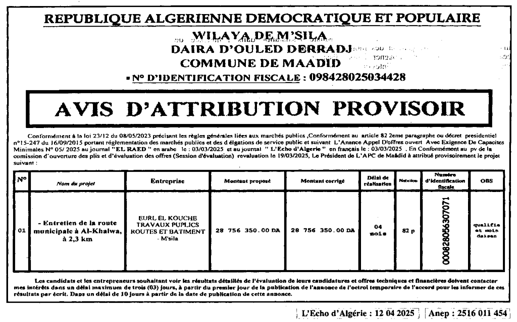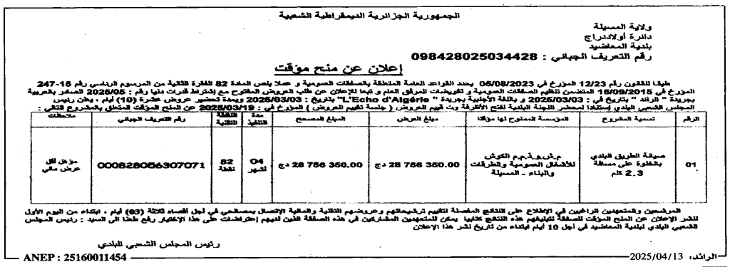 إعلان عن المنح المؤقت صيانة الطريق البلدي بالخلوة على مسافة 2.3 كلم/ بلدية المعاضيد