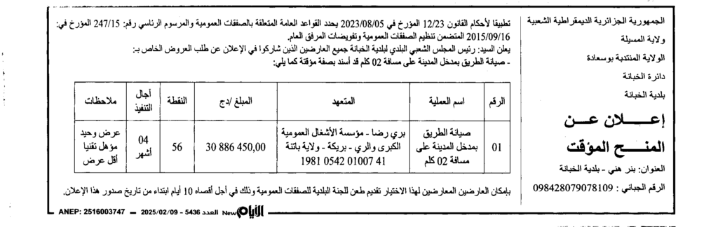 إعلان عن المنح المؤقت صيانة الطريق بمدخل المدينة/ بلدية الخبانة