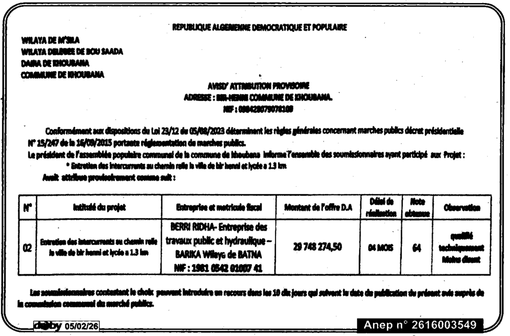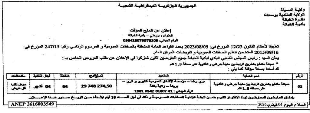 إعلان عن المنح المؤقت صيانة مقاطع بالطريق/ بلدية الخبانة