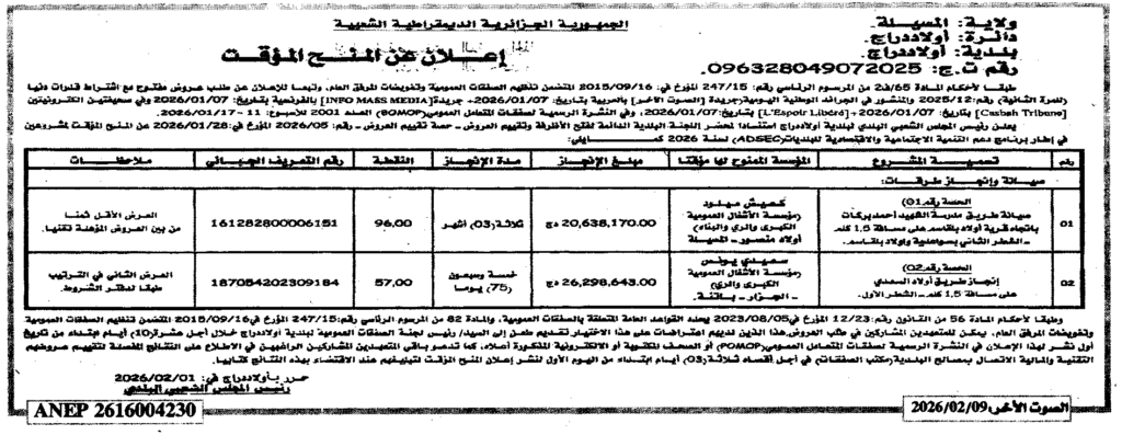 إعلان عن المنح المؤقت صيانة وانجاز الطرقات/ بلدية أولاد دراج