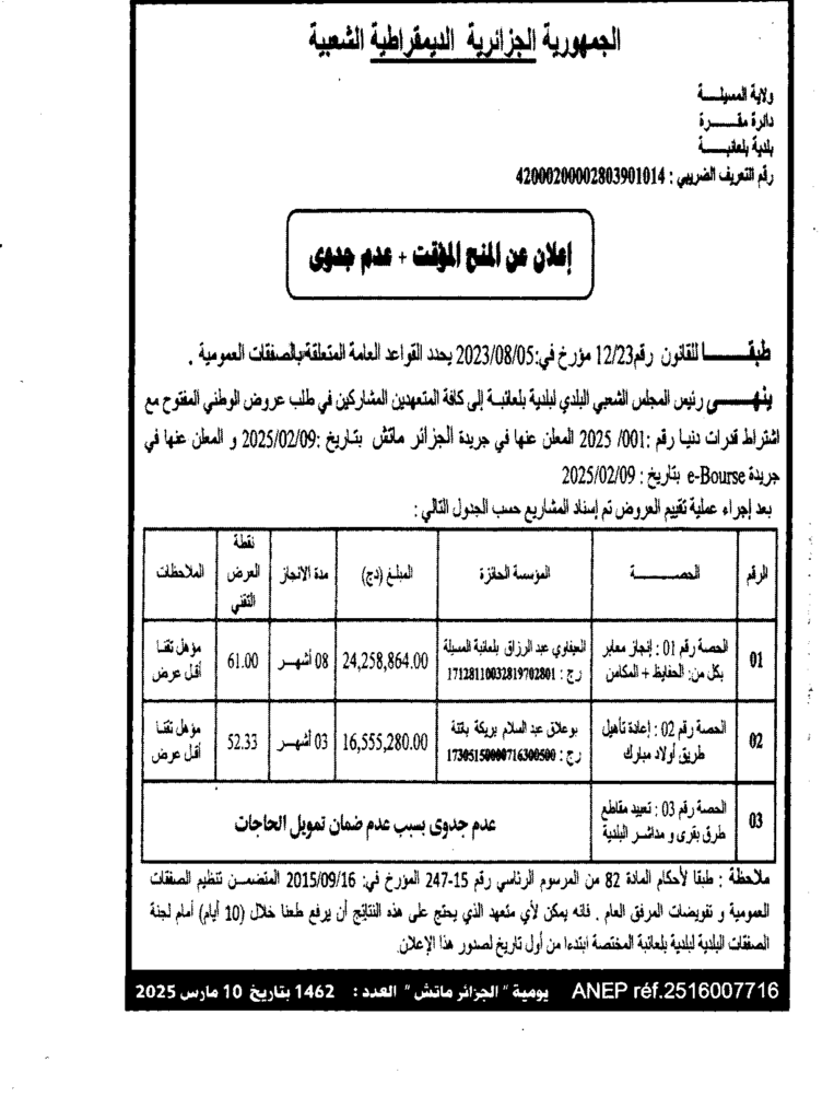 إعلان عن المنح المؤقت + عدم جدوى بلدية بلعايبة