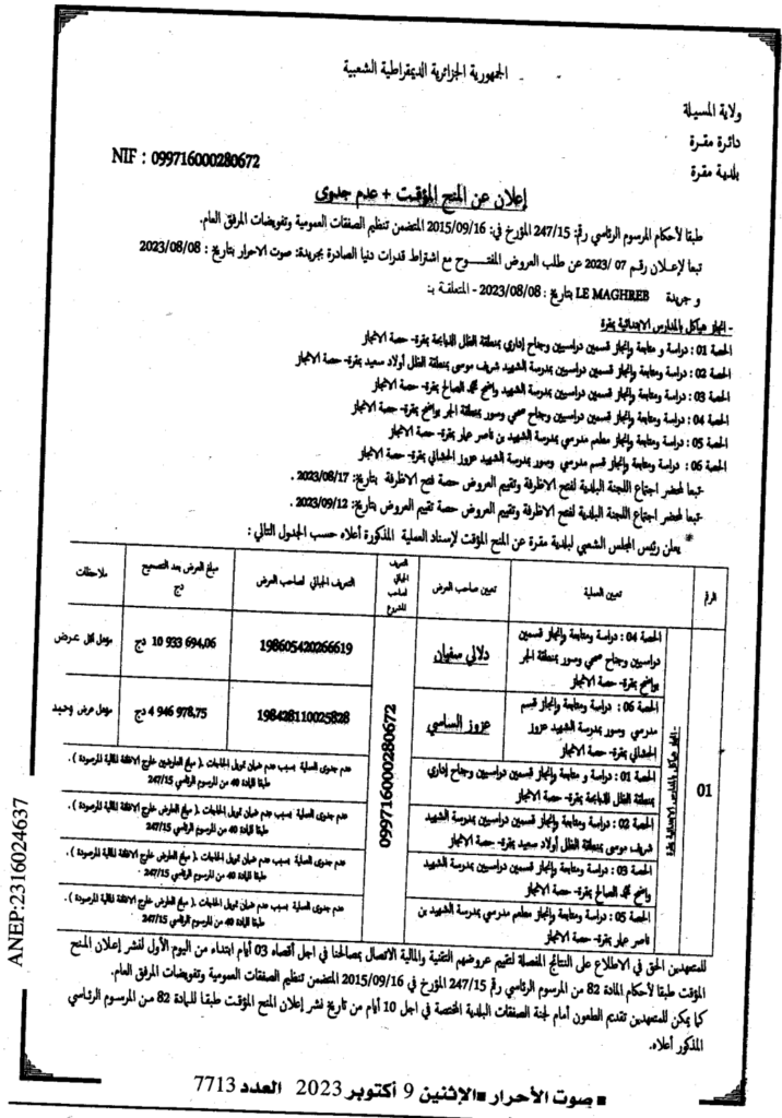 إعلان عن المنح المؤقت + عدم جدوى بلدية مقرة