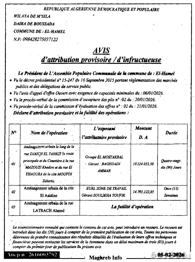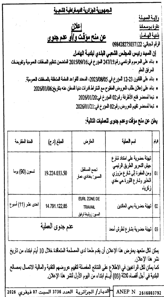 إعلان عن المنح المؤقت + عدم جدوى تهيئة حضرية/ بلدية الهامل