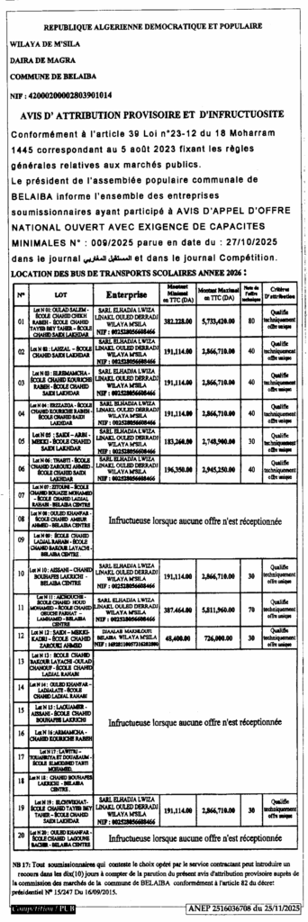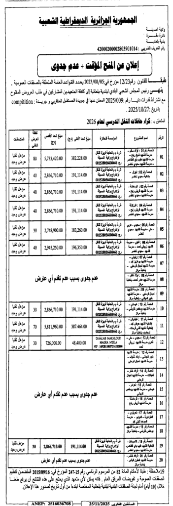 إعلان عن المنح المؤقت + عدم جدوى كراء حافلات النقل المدرسي لعام 2026/ بلدية بلعايبة