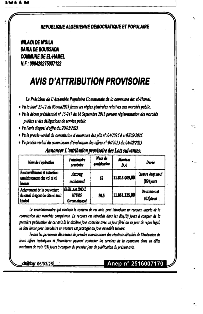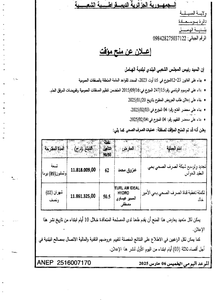 إعلان عن المنح المؤقت عمليات الصرف الصحي/ بلدية الهامل