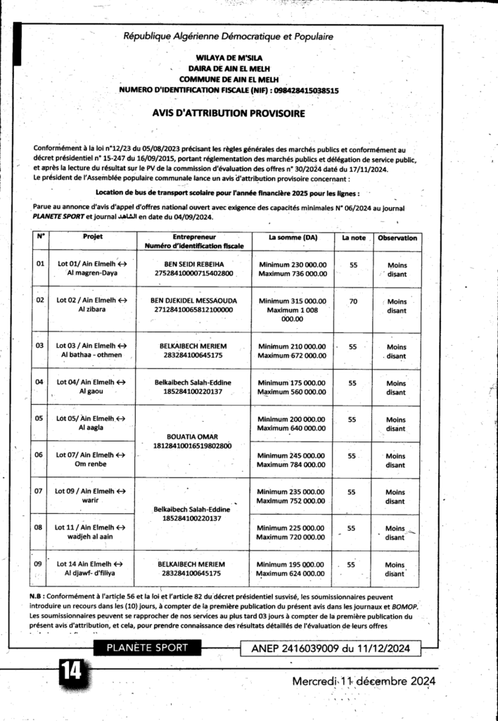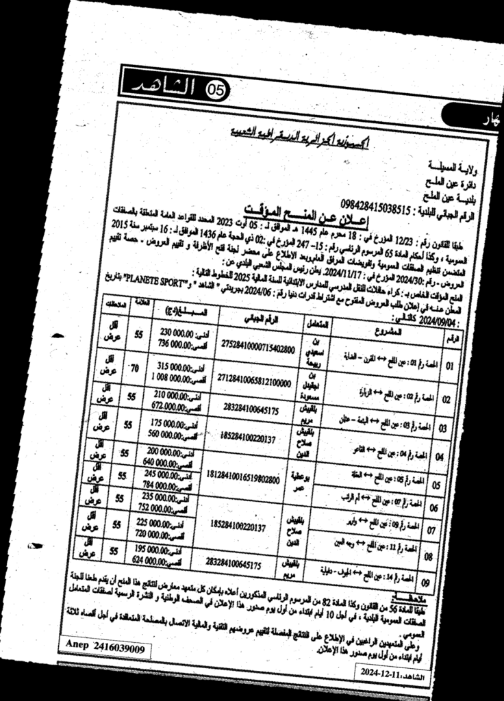 إعلان عن المنح المؤقت كراء حافلات النقل المدرسي للمدارس الابتدائية للسنة المالية 2025/ بلدية عين الملح