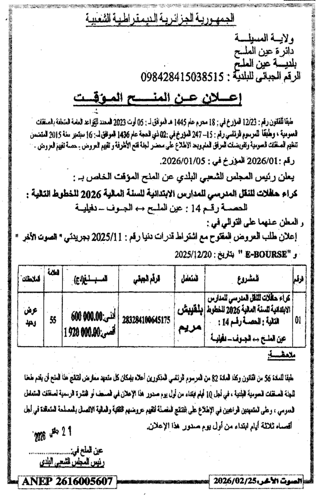 إعلان عن المنح المؤقت كراء حافلات النقل المدرسي/ بلديةعين الملح