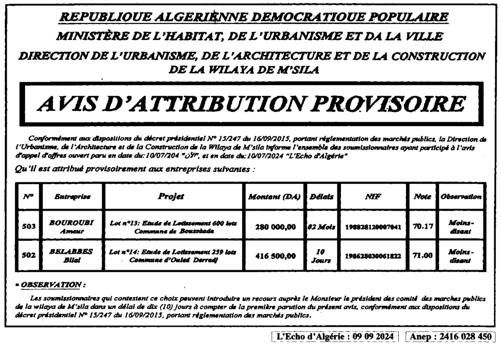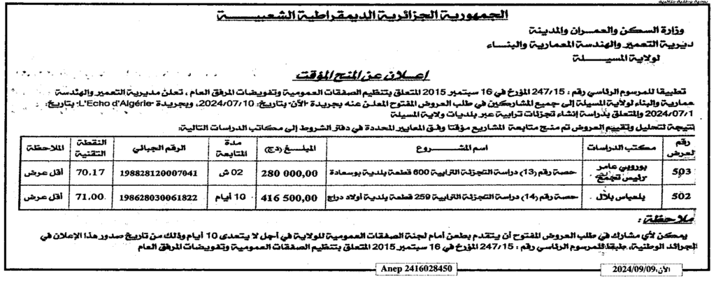 إعلان عن المنح المؤقت لدراسة انشاء تجزئات ترابية عبر بلديات ولاية المسيلة/ مديرية التعمير والهندسة المعمارية والبناء لولاية المسيلة