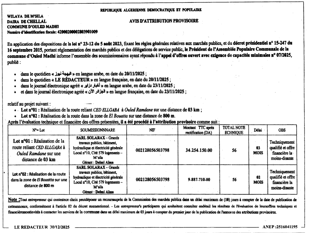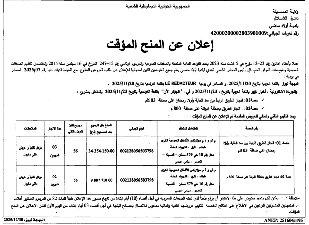 إعلان عن المنح المؤقت لصفقة انجاز الطرق/ بلدية أولاد ماضي