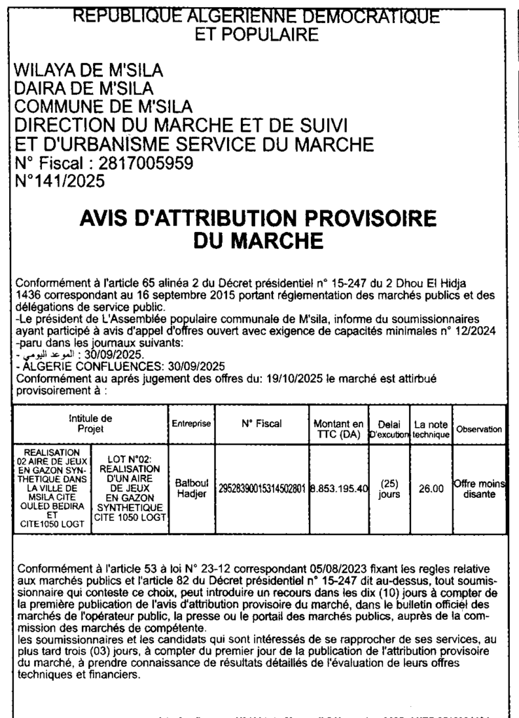 إعلان عن المنح المؤقت لصفقة/ بلدية المسيلة