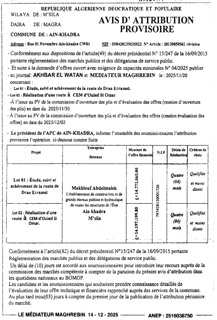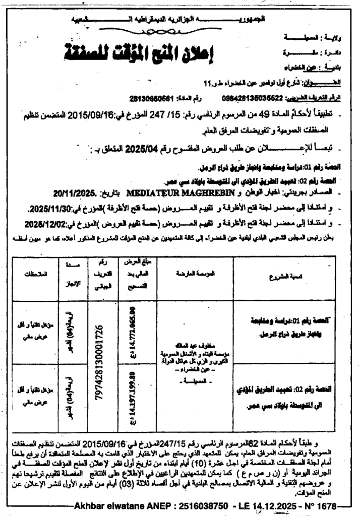 إعلان عن المنح المؤقت لصفقة/ بلدية عين الخضراء