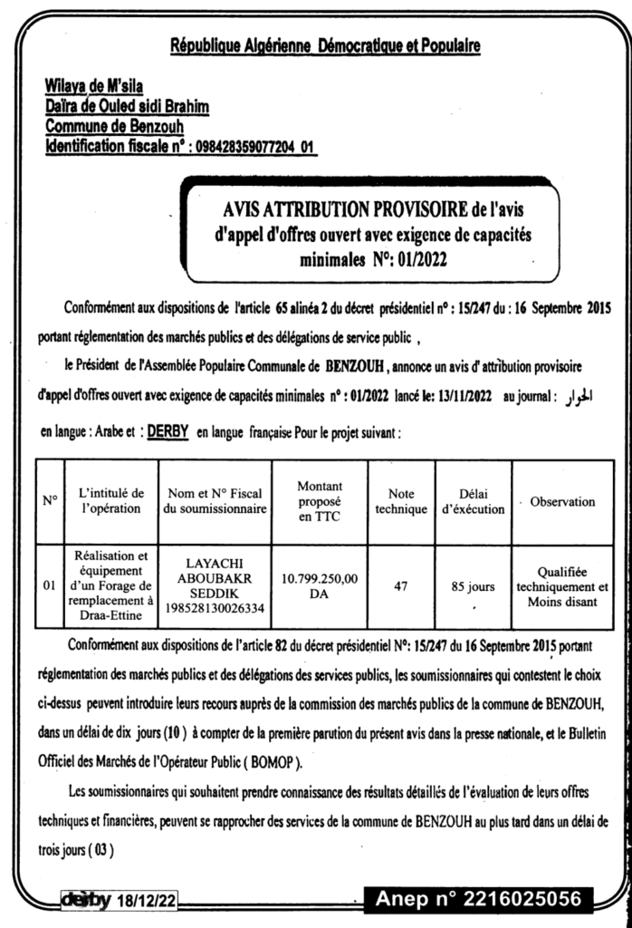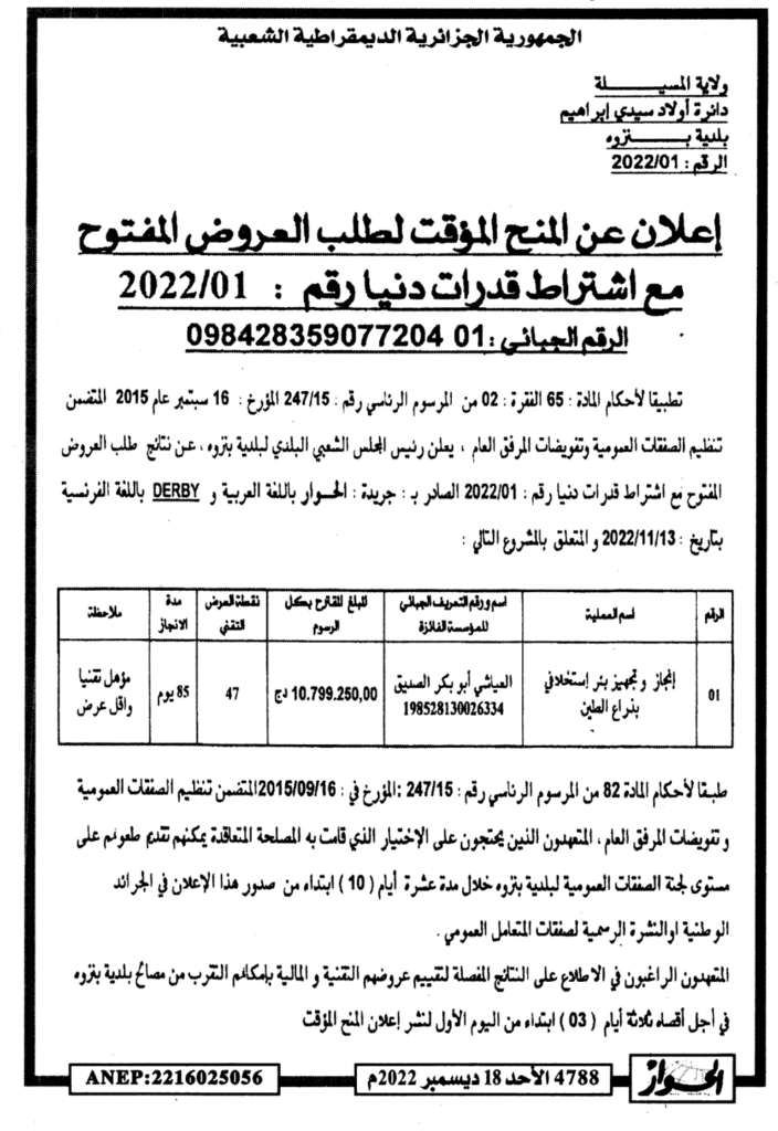 طلب العروض المفتوح مع اشتراط قدرات دنيا والمتعلق بالمشروع التالي: إنجاز وتجهيز بئر إستخلافي بذراع الطين18 ديسمبر، 20220 33 شاركها فيسبوك X مشاركة عبر البريد طباعة