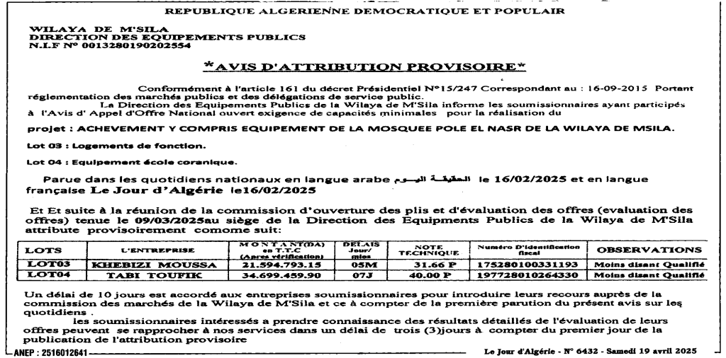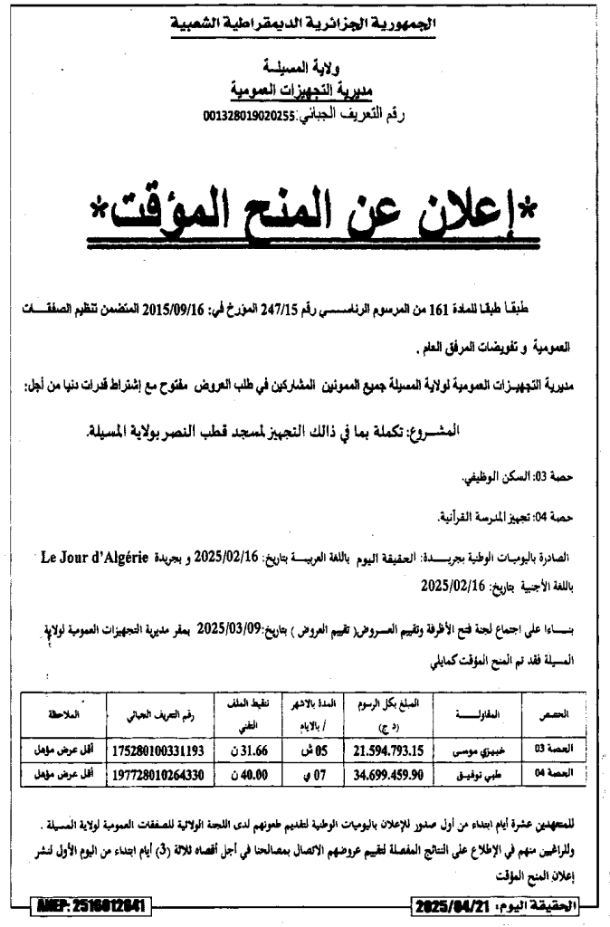إعلان عن المنح المؤقت للصفقة تكملة تجهيز لمسجد قطب النصر بولاية المسيلة/ مديرية التجهيزات العمومية لولاية المسيلة