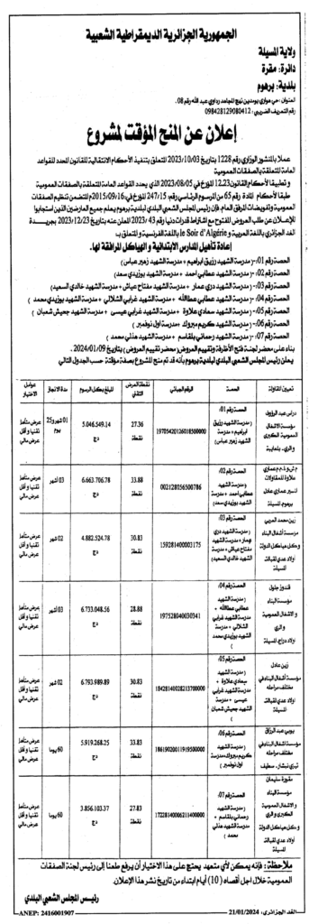 إعلان عن المنح المؤقت لمشروع: إعادة تأهيل المدارس الابتدائية والهياكل المرافقة لها/ بلدية برهوم