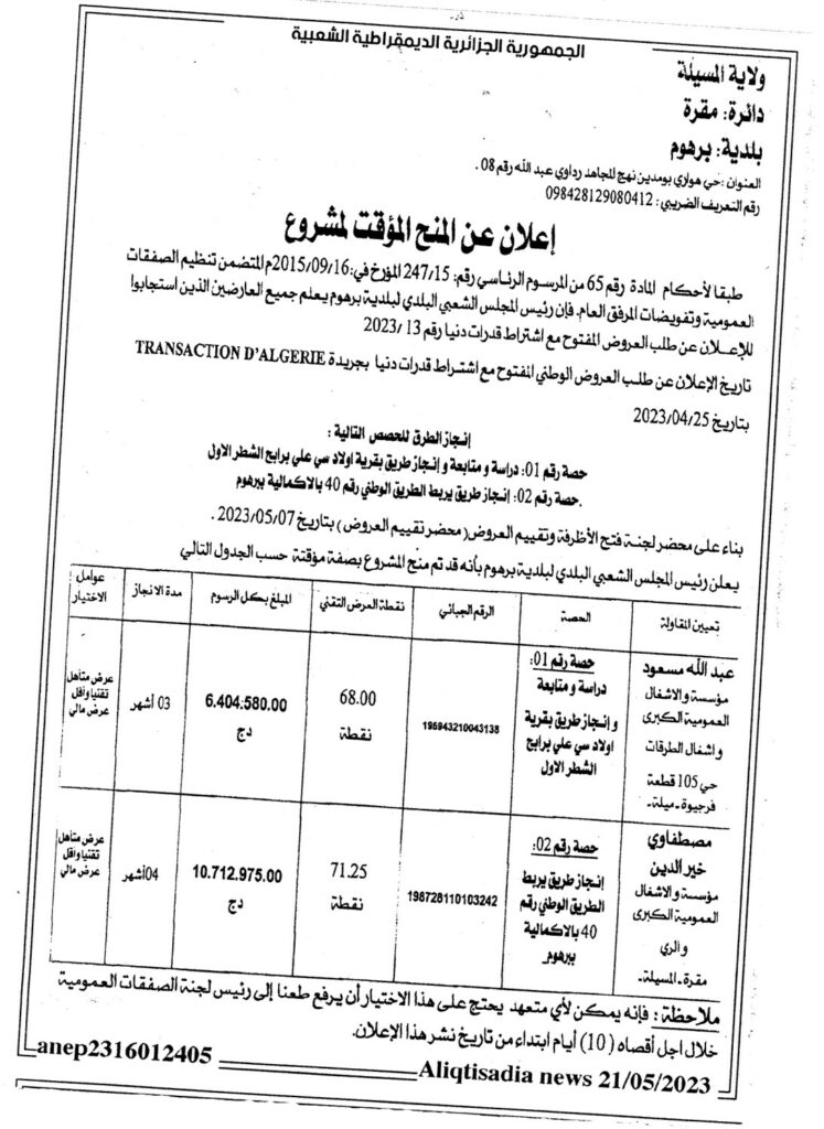 إعلان عن المنح المؤقت لمشروع انجاز الطرق ببلدية برهوم