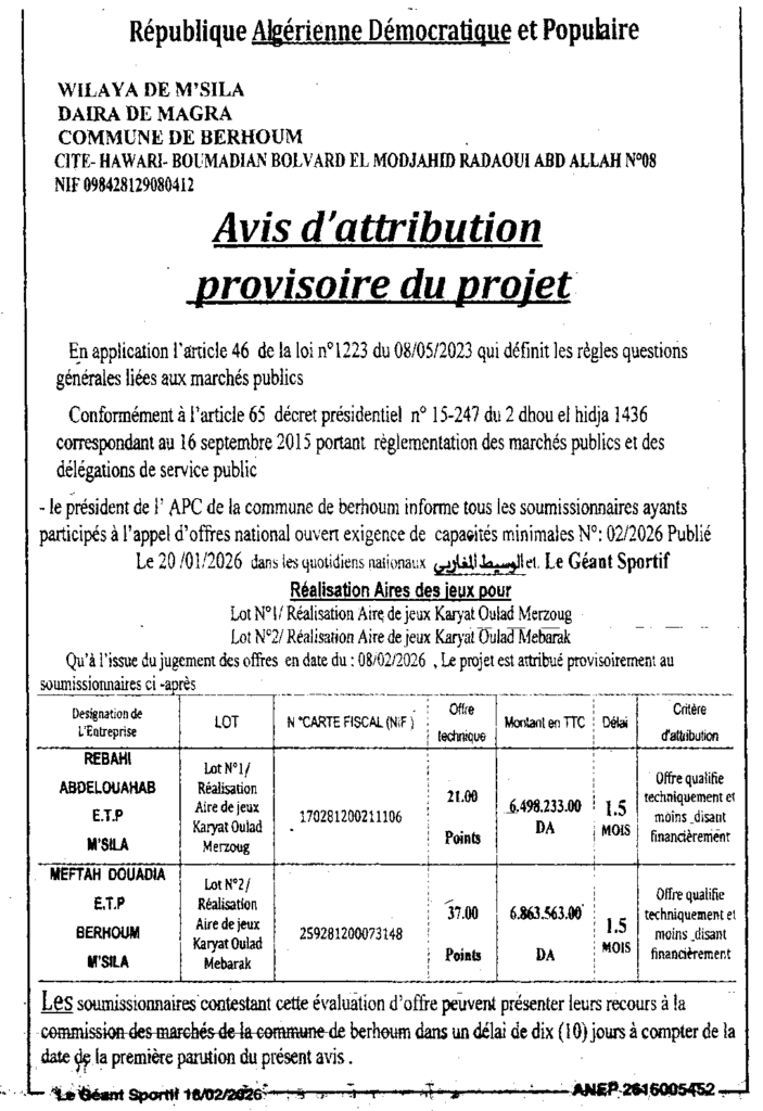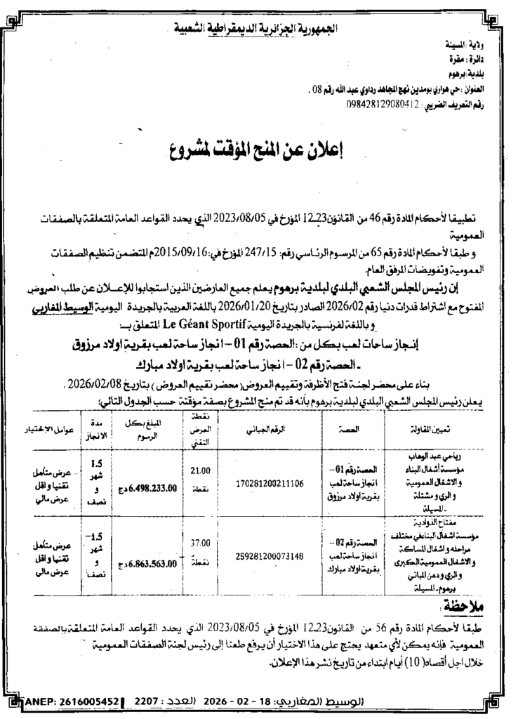 إشعارات بالمنحالصفقات العمومية