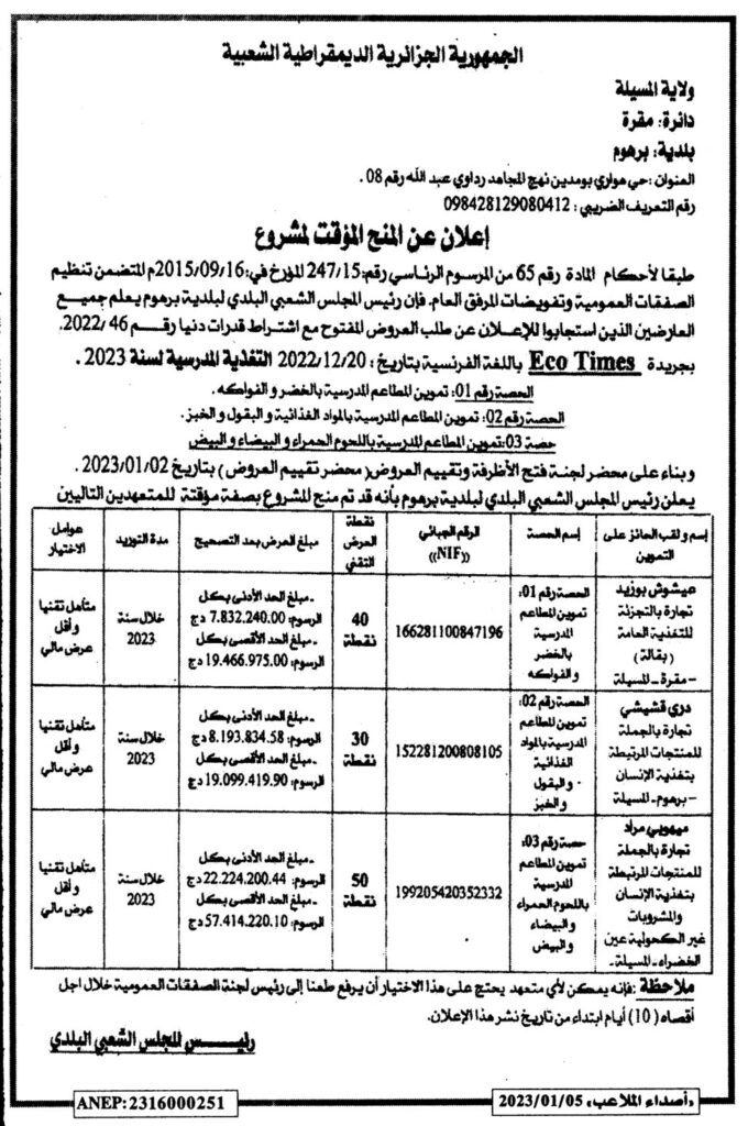 إعلان عن المنح المؤقت لمشروع/ بلدية برهوم