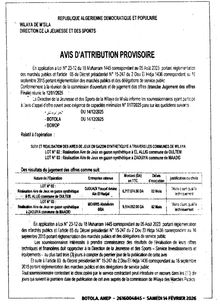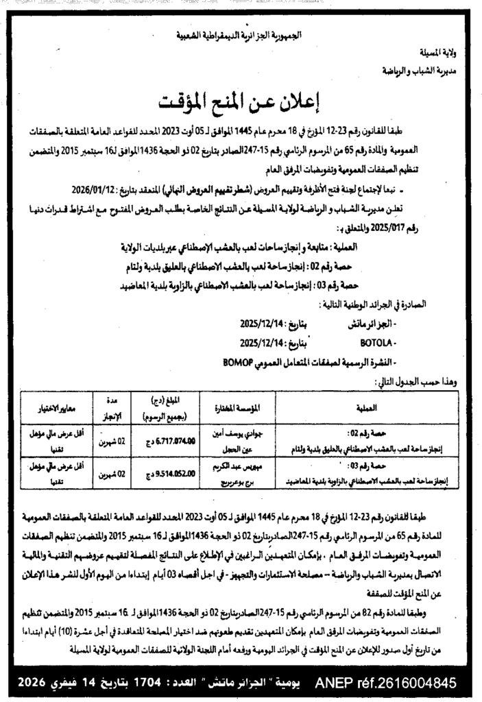 إعلان عن المنح المؤقت متابعة وانجاز ساحة لعب بالعشب الاصطناعي/ مديرية الشباب والرياضة لولاية المسيلة