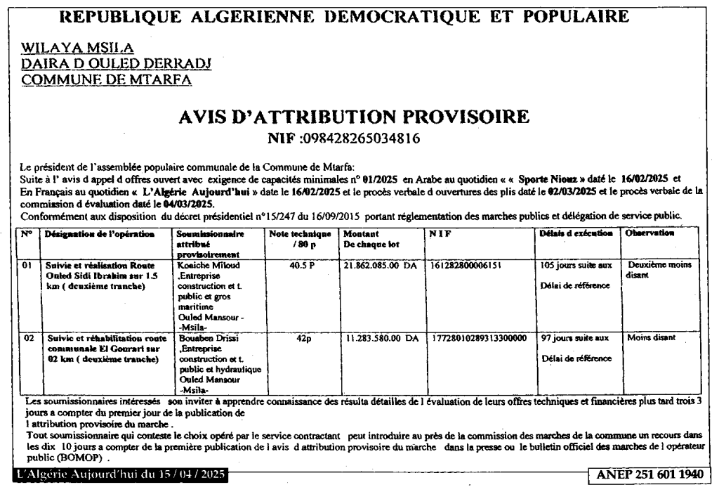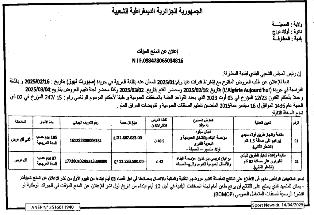إعلان عن المنح المؤقت متابعة وانجاز طرق ببلدية المطارقة