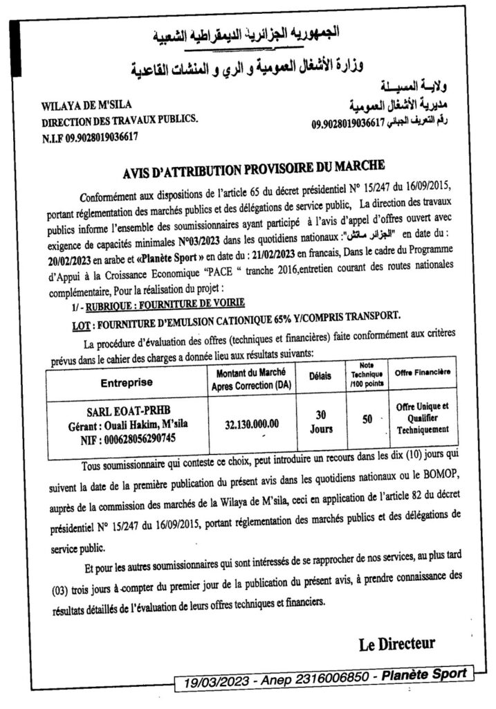 إعلان عن المنح المؤقت/ مديرية الأشغال العمومية
