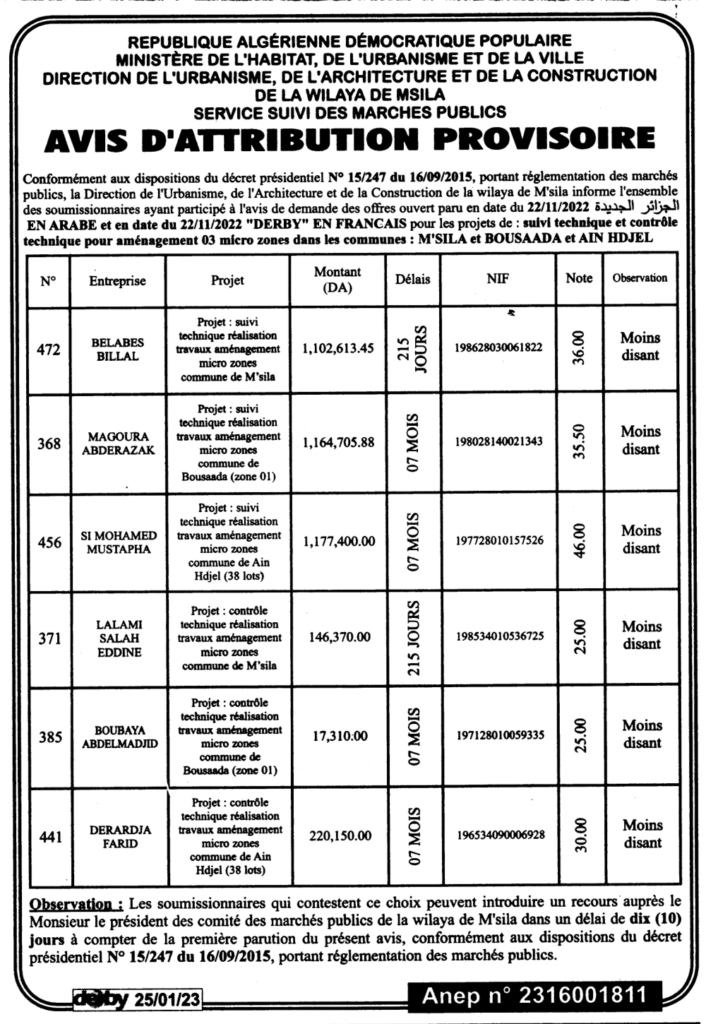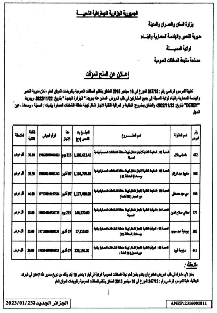إعلان عن المنح المؤقت/ مديرية التعمير والهندسة المعمارية والبناء لولاية المسيلة
