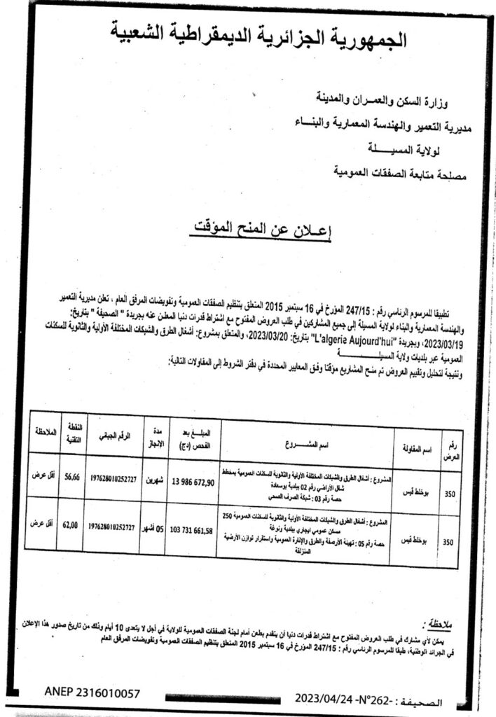 إعلان عن المنح المؤقت/ مديرية التعمير والهندسة المعمارية والبناء لولاية المسيلة