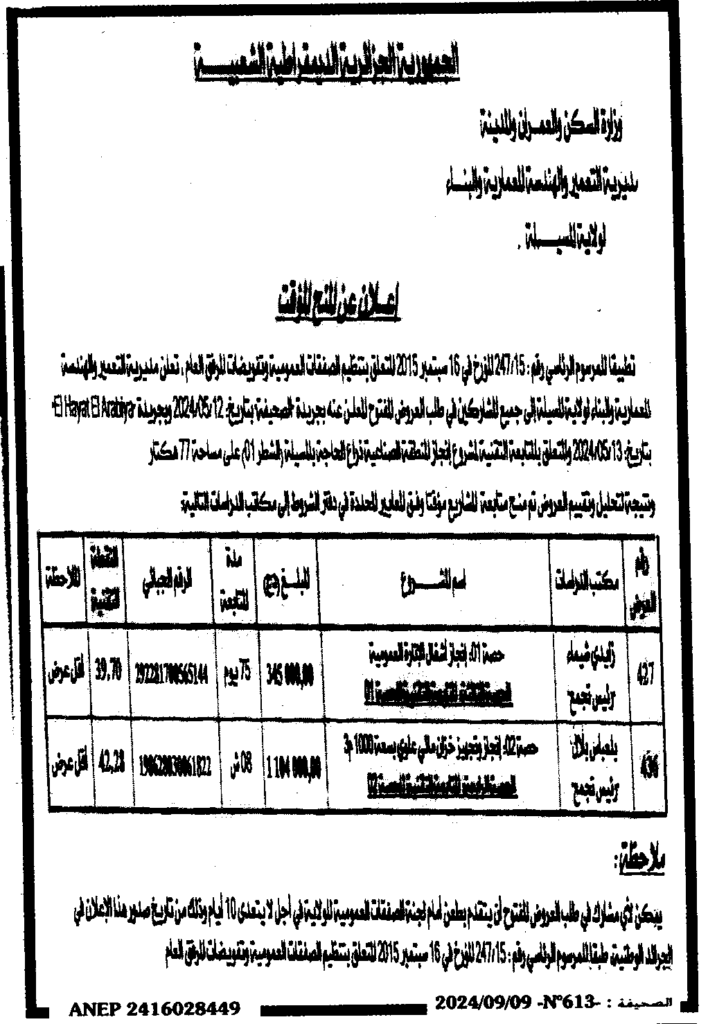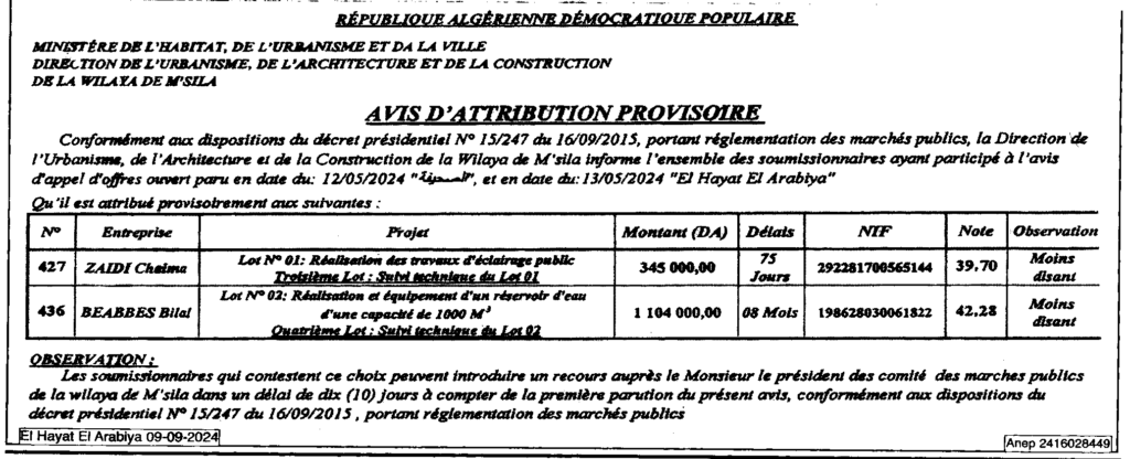 إعلان عن المنح المؤقت/ مديرية التعمير والهندسة المعمارية والبناء لولاية المسيلة
