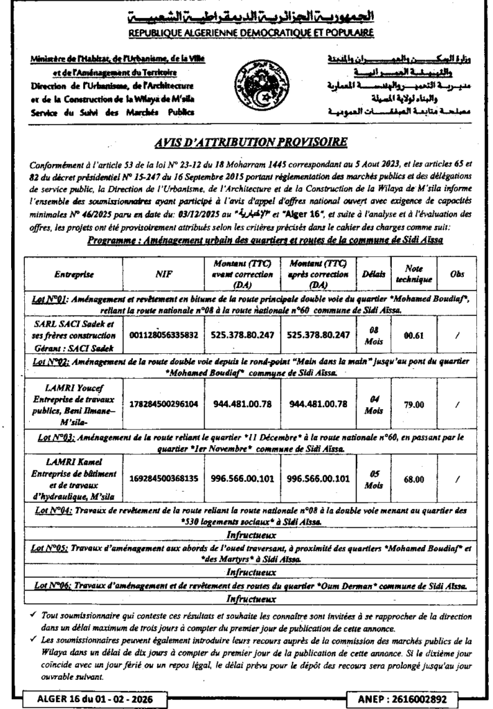 إعلان عن المنح المؤقت/ مديرية التعمير والهندسة المعمارية والبناء لولاية المسيلة