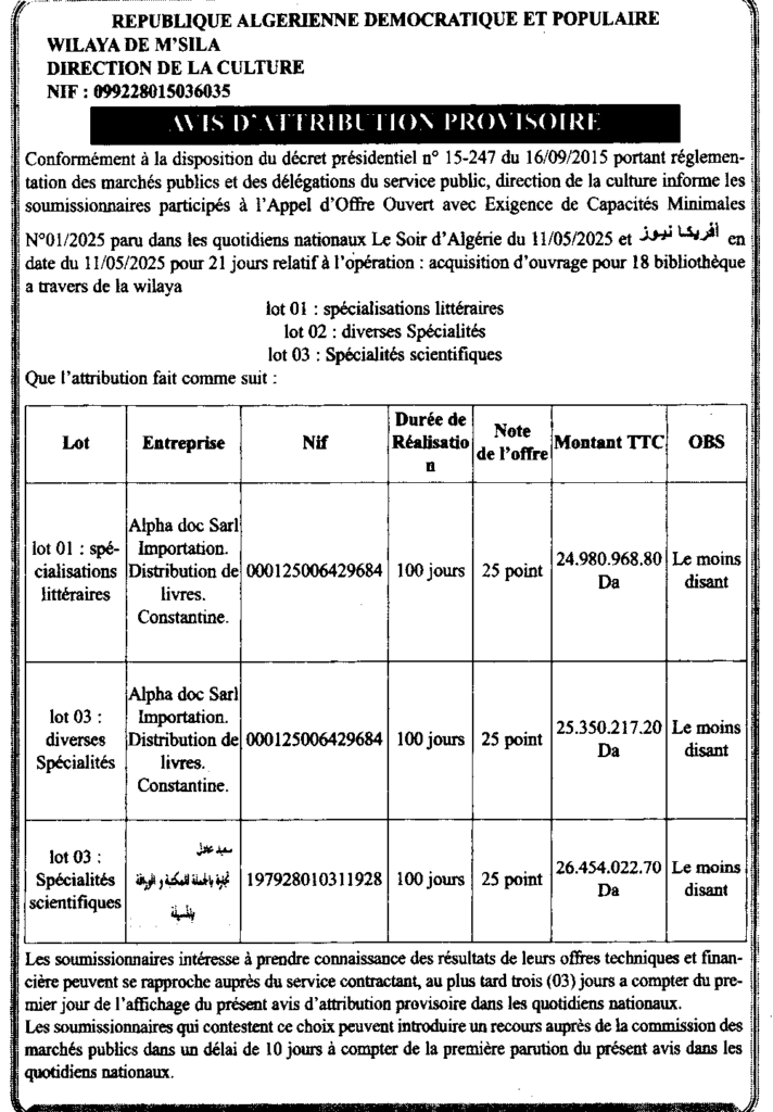 إعلان عن المنح المؤقت / مديرية الثقافة لولاية المسيلة