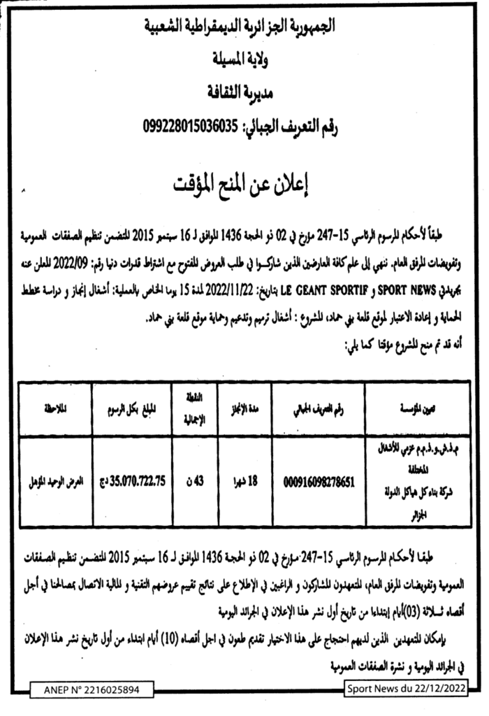 إعلان عن المنح المؤقت/ مديرية الثقافة لولاية المسيلة