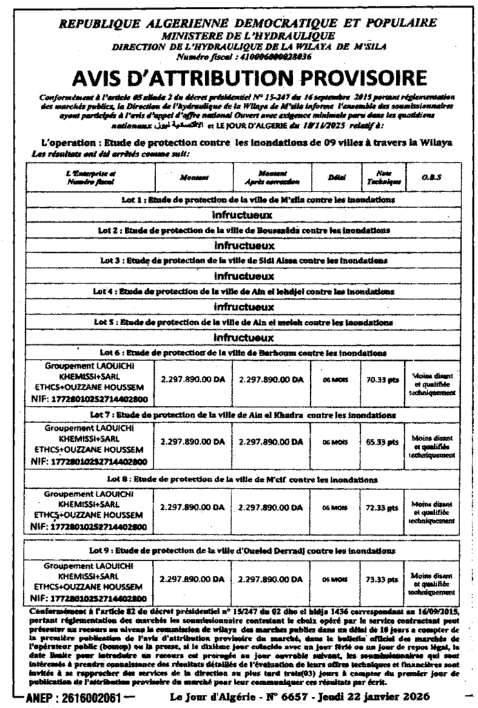 إعلان عن المنح المؤقت/ مديرية الري لولاية المسيلة