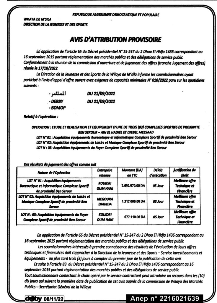 إعلان عن المنح المؤقت مديرية الشباب والرياضة ولاية المسيلة