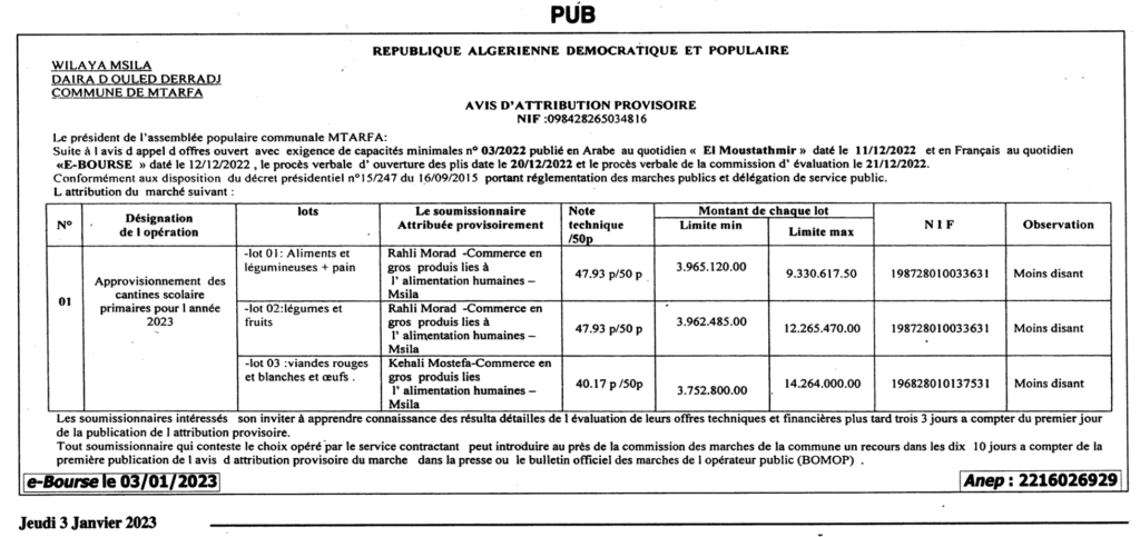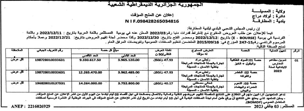 طلب عروض مفتوح مع اشتراط قدرات دنيا قصد: تموين مطاعم المدارس الابتدائية لسنة 20233 يناير، 20230 38 شاركها فيسبوك X مشاركة عبر البريد طباعة