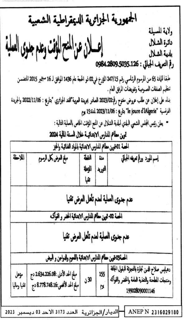 إعلان عن المنح المؤقت وعدم جدوى العملية: تموين مطاعم المدارس الابتدائية خلال السنة المالية 2024/ بلدية الشلال