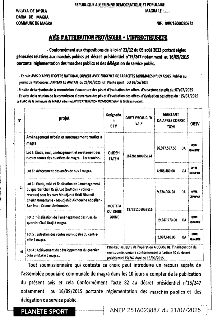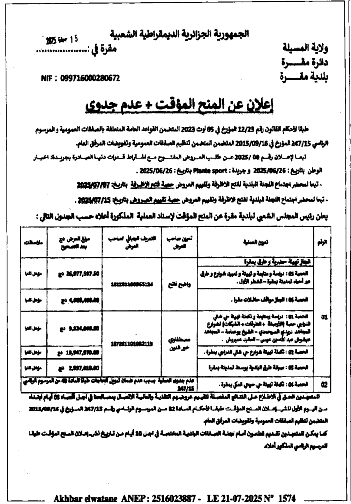 إعلان عن المنح المؤقت وعدم جدوى انجاز تهيئة حضرية وطرق بلدية مقرة