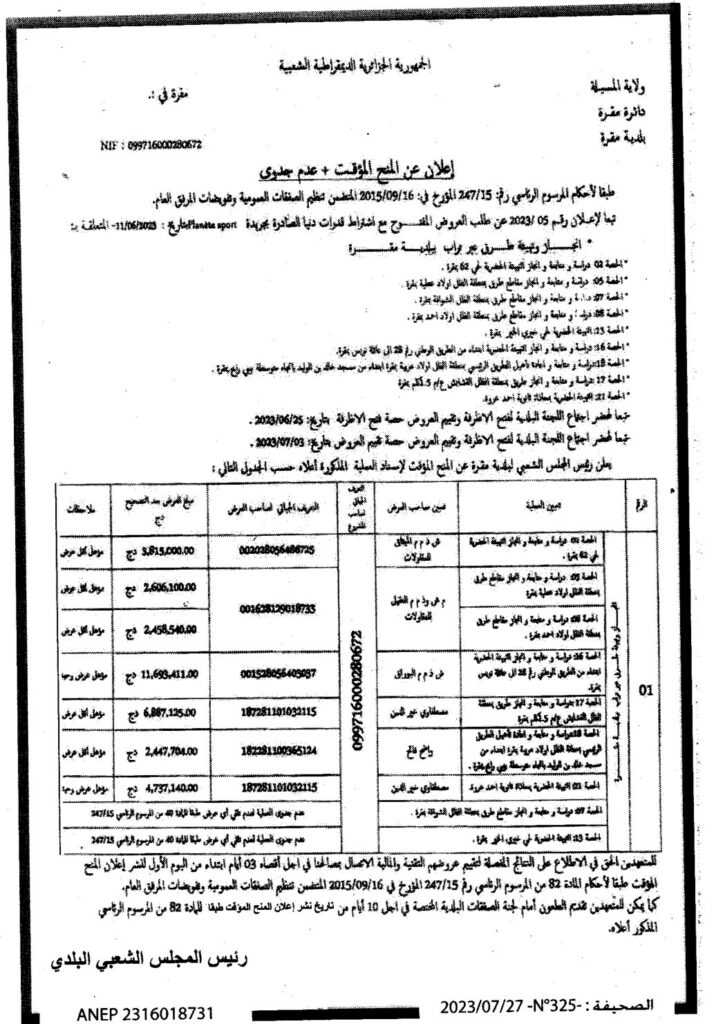 إعلان عن المنح المؤقت وعدم جدوى: انجاز وتهيئة طرق عبر بلدية مقرة
