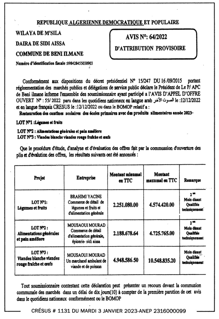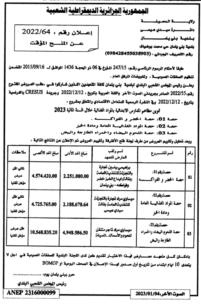 إعلان عن المنح المؤقت 2022/64 بلدية بني بلمان