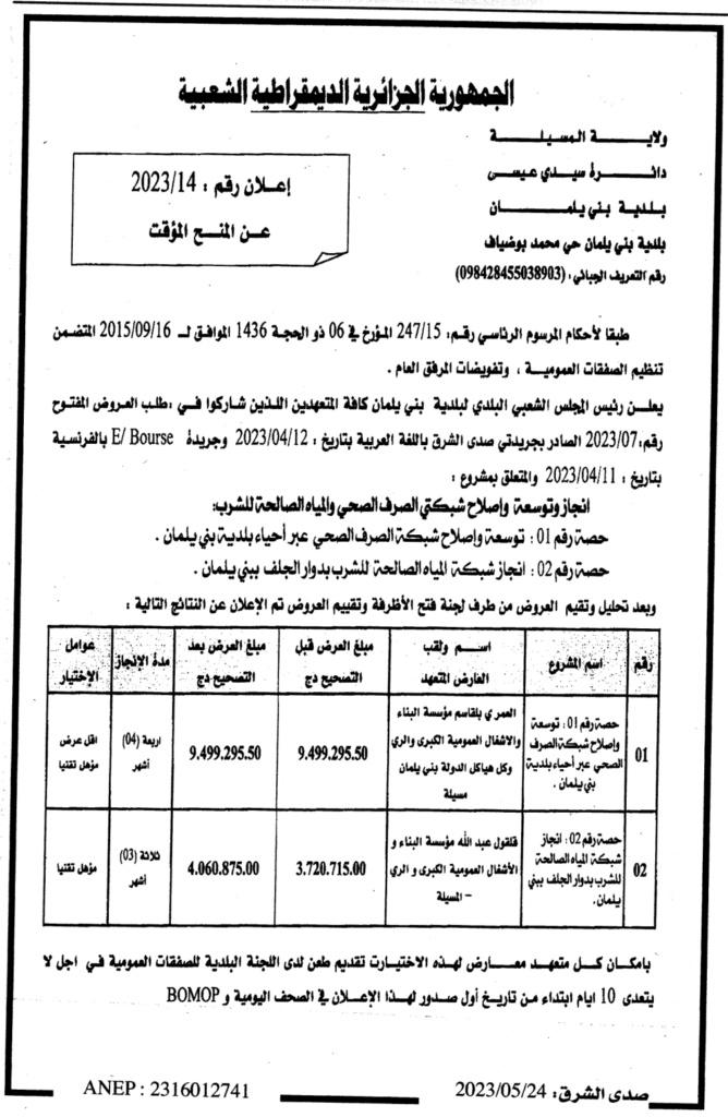 إعلان عن المنح المؤقت 2023/14 بلدية بني يلمان