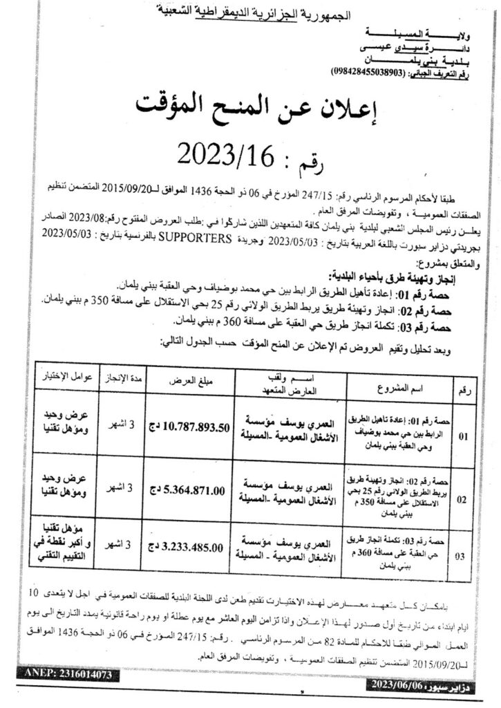 إعلان عن المنح المؤقت 2023/16 بلدية بني يلمان