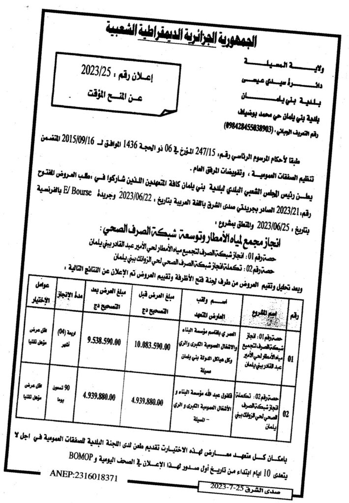 إعلان عن المنح المؤقت 2023/25 بلدية بني يلمان