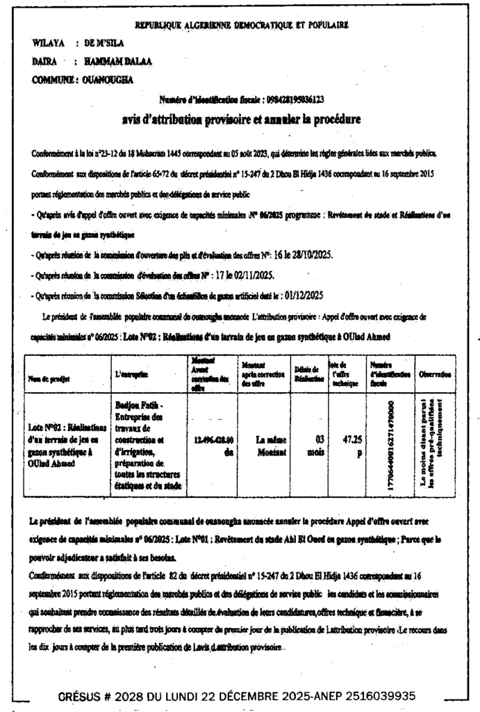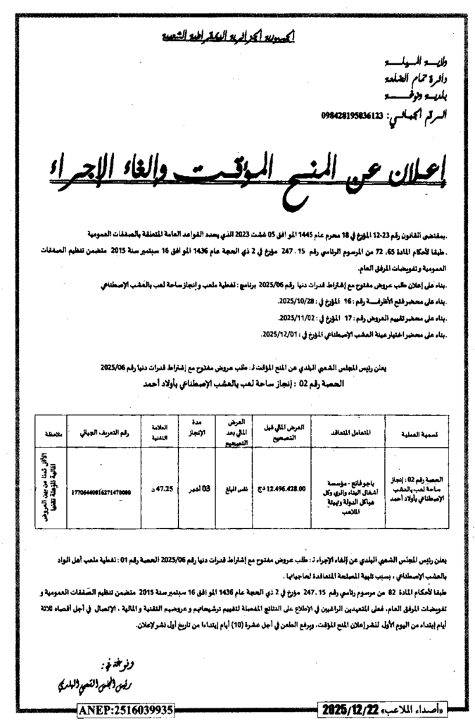 إعلان عن المنح وإلغاء الإجراء تغطية ملعب وانجاز ساحة لعب بالعشب الاصطناعي / بلدية ونوغة