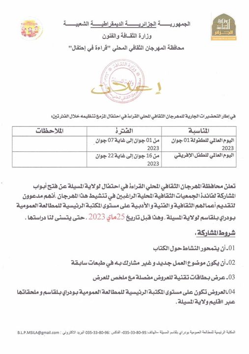 إعلان عن المهرجان الثقافي المحلي “قراءة في احتفال”