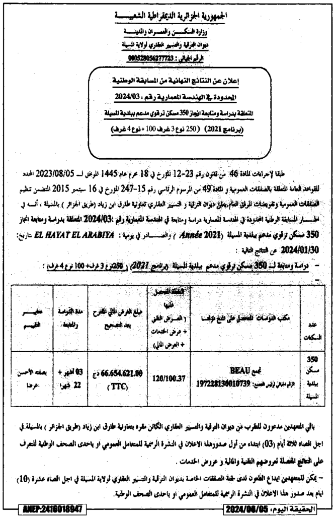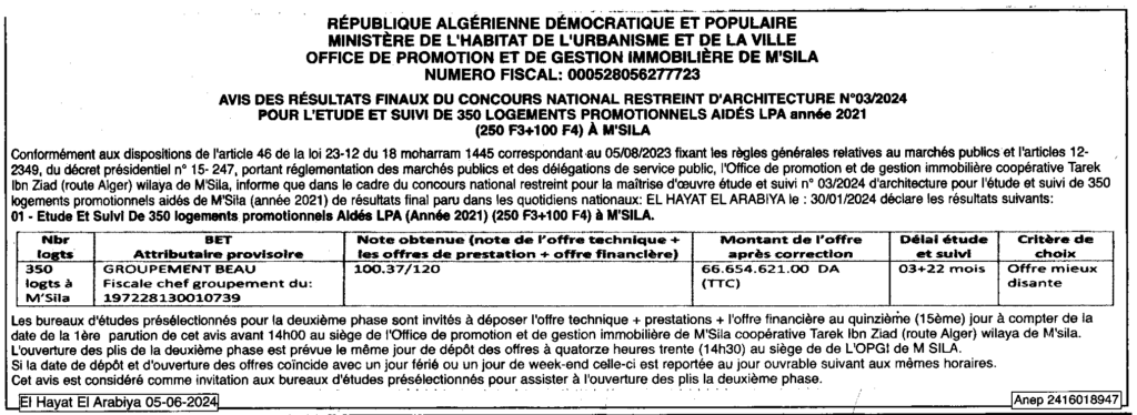 إعلان عن النتائج النهائية من المسابقة الوطنية المحدودة في الهندسة المعمارية 2024/03 لدراسة ومتابعة انجاز 350 مسكن ترقوي مدعم ببلدية المسيلة لسنة 2021/ ديوان الترقية والتسيير العقاري لولاية المسيلة