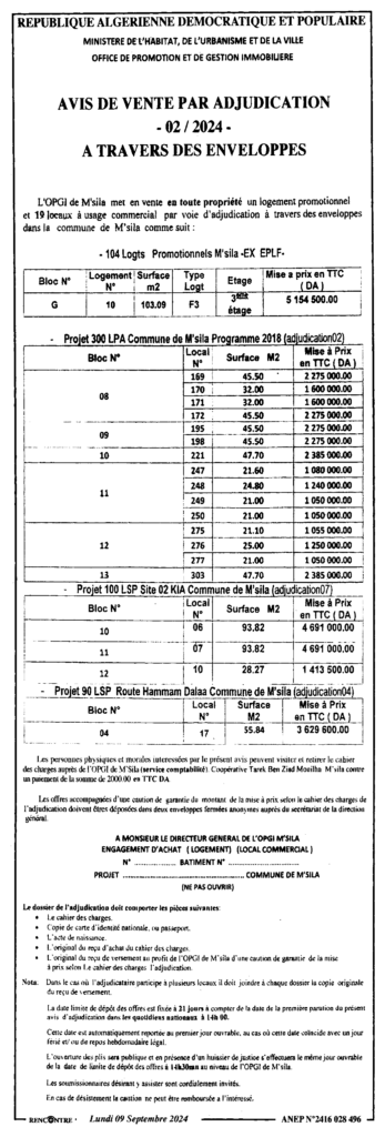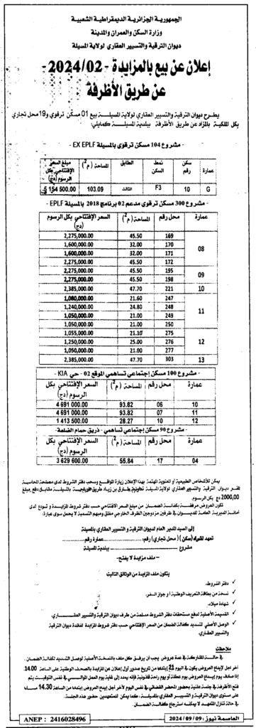 إعلان عن بيع بالمزايدة 2024/02 عن طريق الأظرفة/ ديوان الترقية والتسيير العقاري لولاية المسيلة