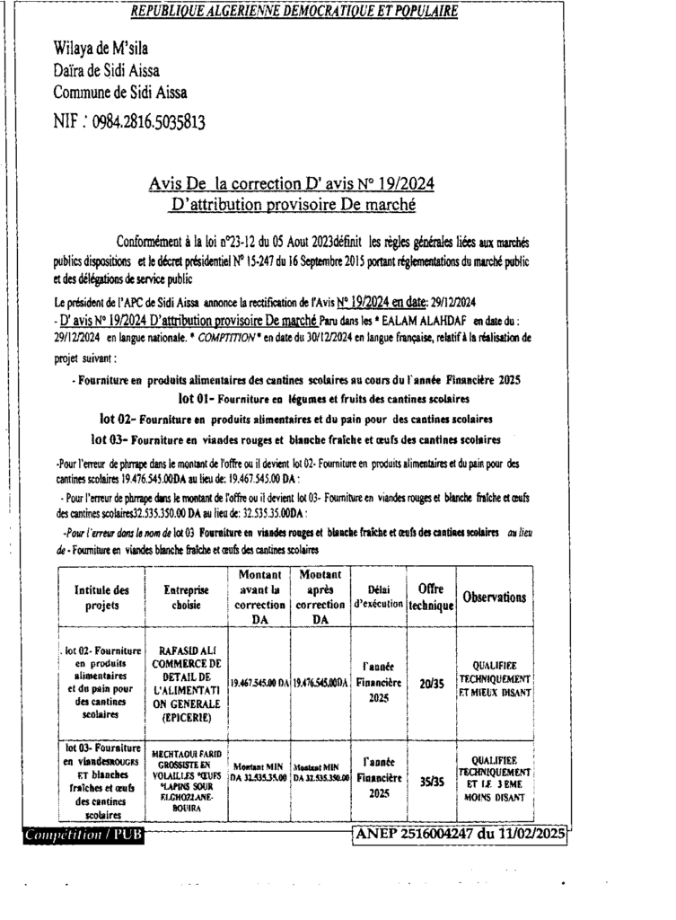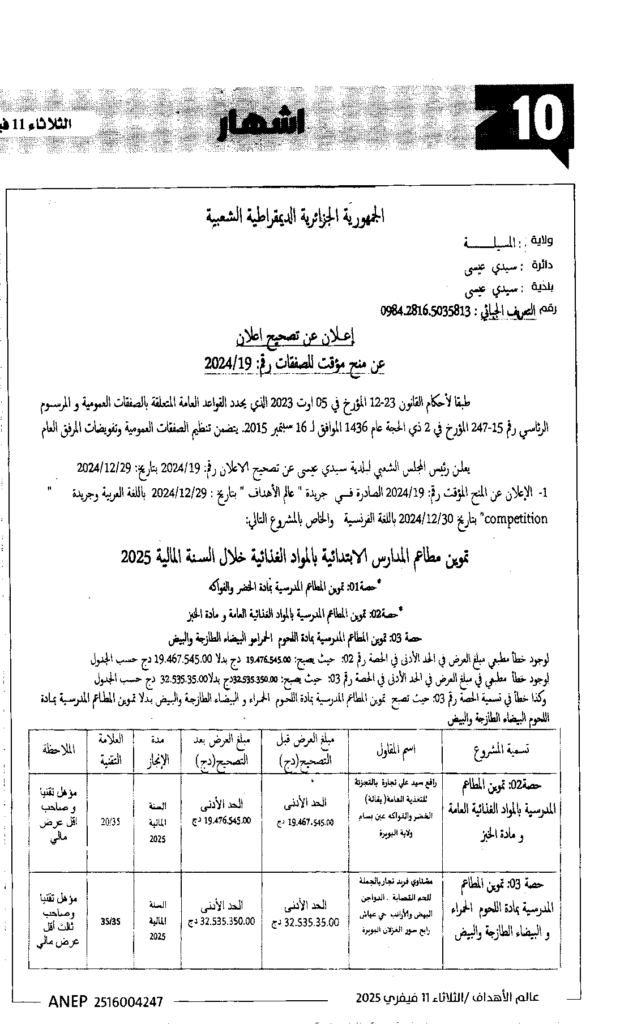 إعلان عن تصحيح إعلان عن منح مؤقت للصفقات 2025/19 بلدية سيدي عيسى