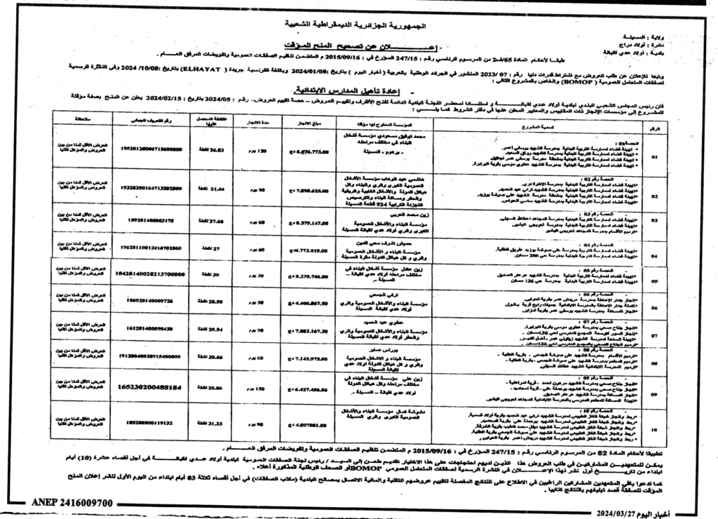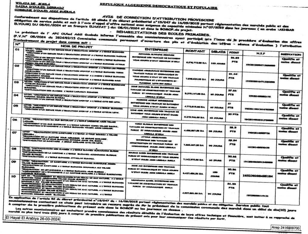 إعلان عن تصحيح المنح المؤقت: إعادة تأهيل المدارس الابتدائية/ بلدية أولاد عدي لقبالة